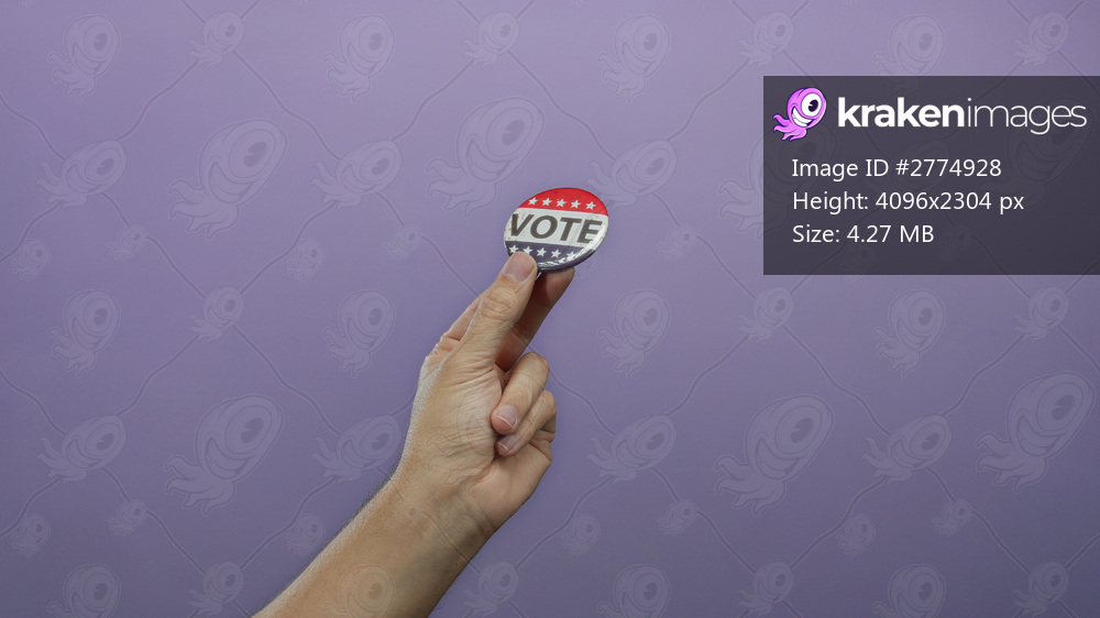 Man holding a vote button against a purple wall background, emphasizing civic participation and election season.