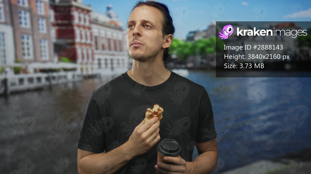 Man holding a waffle and coffee cup while eating on a street by a canal and looking up at buildings; quiet contemplation.