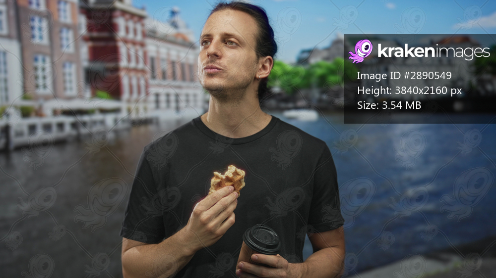 Man holding a waffle and coffee cup while eating on a street by a canal and looking up at buildings; quiet contemplation.