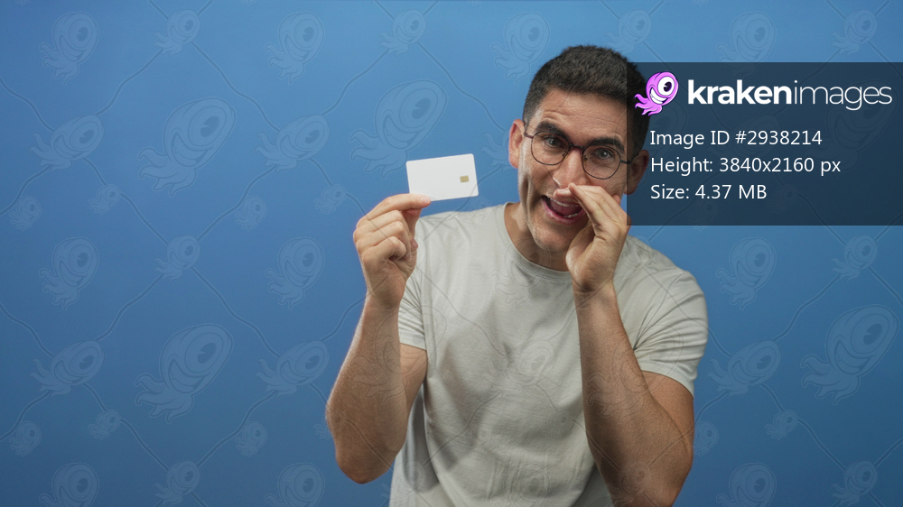 Man holding a white creditcard and cupping mouth while shouting in blue studio, wearing glasses and light tee; excitement promotion.