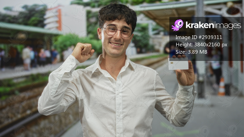 Man holding a white creditcard and raising a fist on a train station building platform while smiling; confidence success.