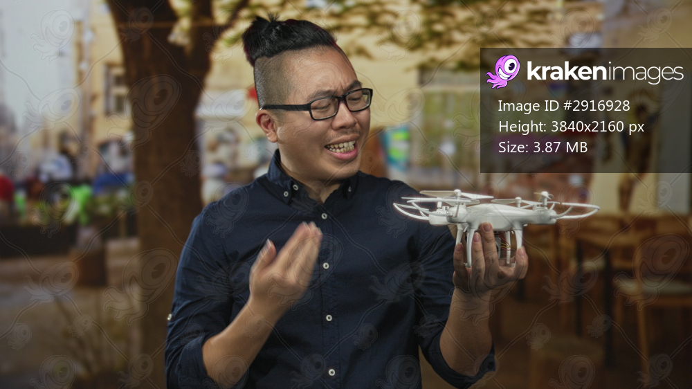 Man holding a white drone in one hand and gesturing with the other on a building terrace; tech troubleshooting frustration.