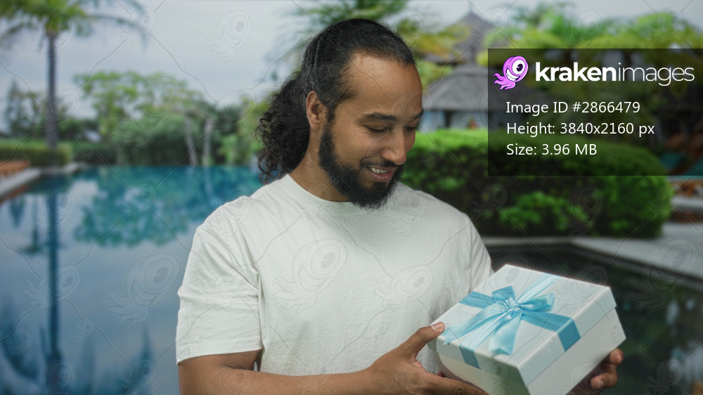 Man holding a white gift box with blue ribbon and showing his hands by a pool prop in a studio set; gift giving joy.