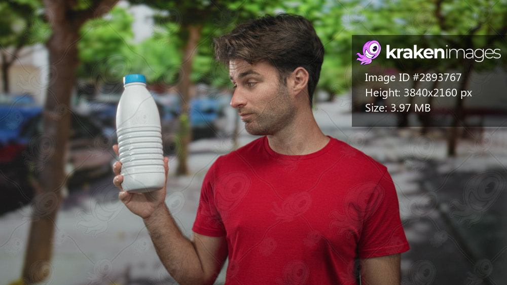 Man holding a white plastic bottle in one hand on a city street, wearing a red shirt and making a skeptical face; skepticism product concern.