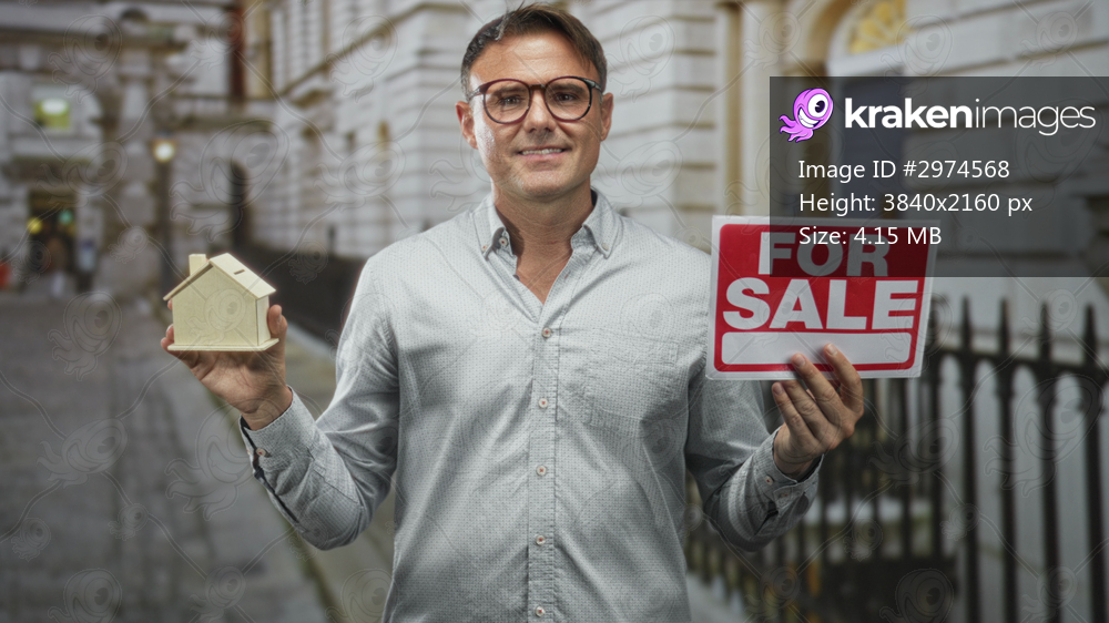 Man holding a wooden house model and a red for sale sign with both hands while smiling outside a stone building on street; property confidence.