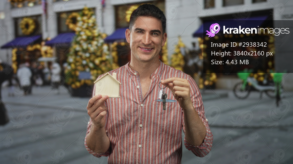 Man holding a wooden house model in one hand and a keyring in the other on a city street storefront display; homeownership pride.
