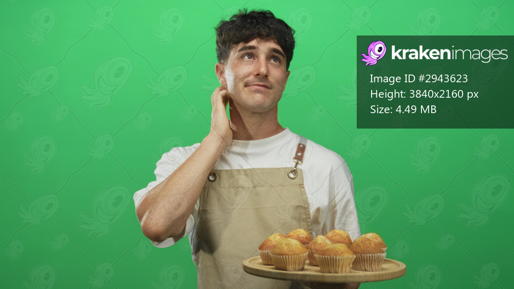 Man holding a wooden tray of muffins, hand on cheek, wearing apron and looking up in green studio; thoughtful.