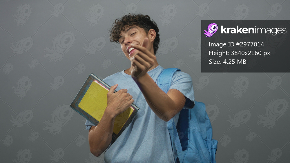 Man holding a yellow notebook against his chest, wearing a blue shirt and backpack, smiling broadly while making a finger heart with his hand in studio; cheerful confidence. - Kraken Images