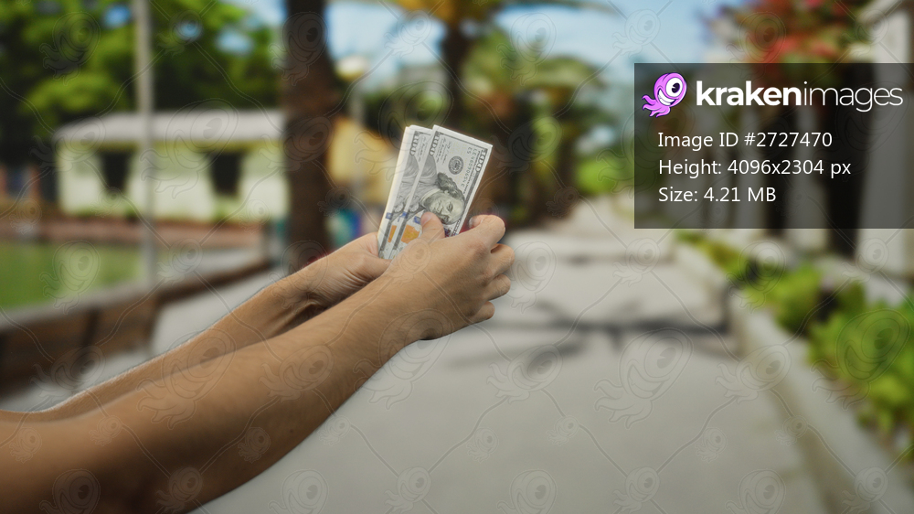 Man holding american dollar banknotes on a city street, displaying financial concepts in an outdoor urban environment.