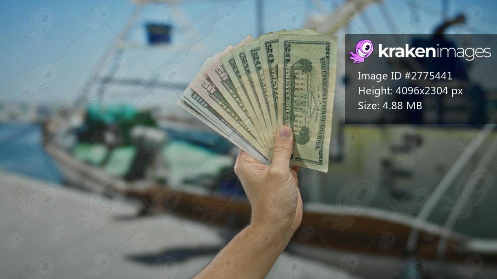 Man holding american dollars at seaside port with boats in background, showcasing concept of finance, travel, and maritime lifestyle, emphasizing outdoor setting and caucasian ethnicity. - Kraken Images