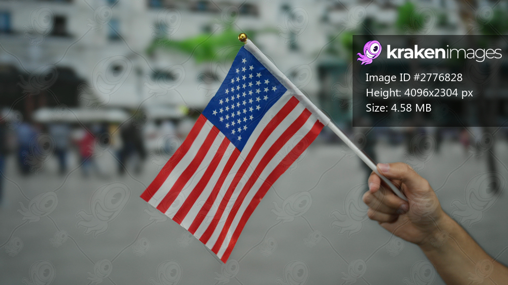 Man holding american flag outdoors on a busy street, blurred city background highlights patriotic theme with vibrant colors and diverse movement in the urban scene. - Kraken Images