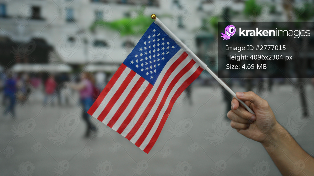 Man holding american flag outdoors on a busy street, blurred city background highlights patriotic theme with vibrant colors and diverse movement in the urban scene. - Kraken Images