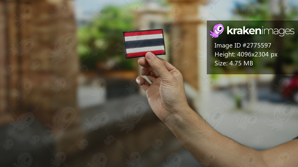 Man holding an embroidered thai flag patch outdoors in a city street setting, showcasing the intricate detail of the fabric design against a blurred urban background. - Kraken Images