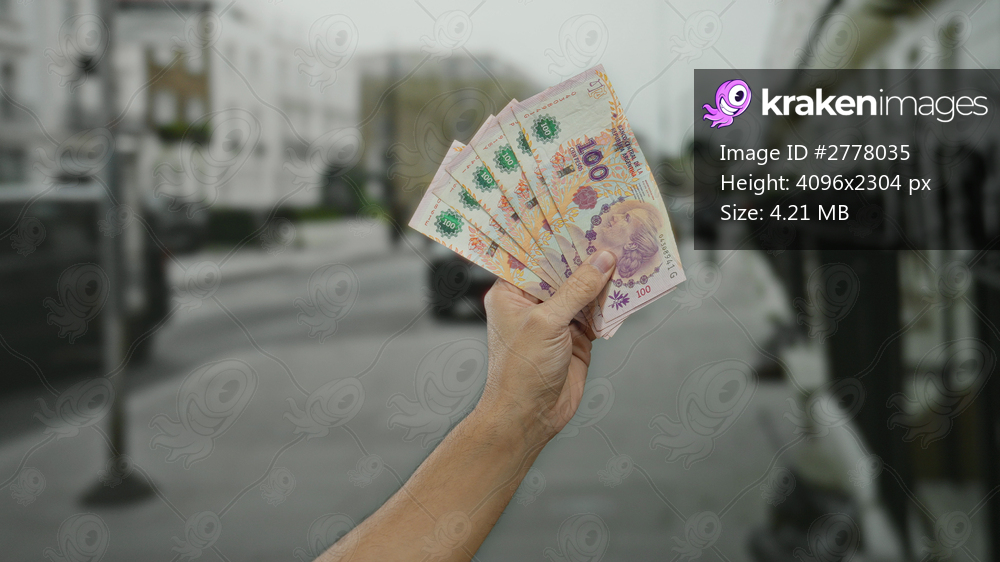 Man holding argentine pesos in an urban street, showcasing vibrant currency amidst city life, emphasizing commerce and financial themes outdoors.