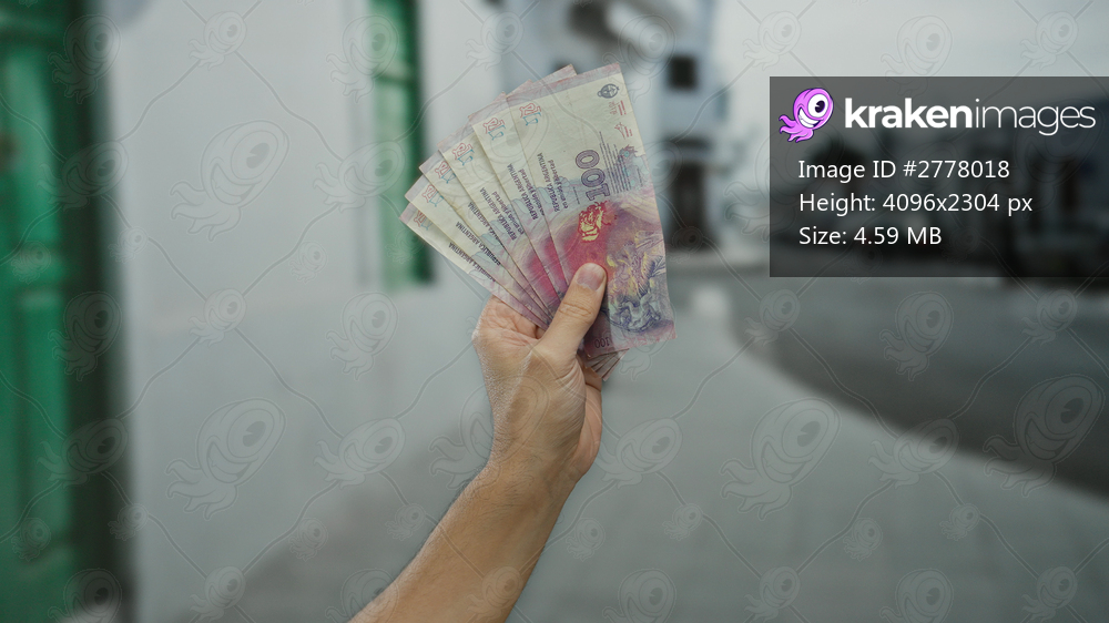 Man holding argentine pesos on a city street with his hand prominently displaying banknotes against an outdoor urban backdrop, capturing the essence of financial transactions. - Kraken Images