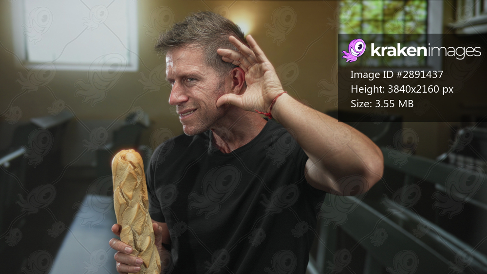 Man holding baguette with both hands while cupping his ear with right hand in church building pews near stained glass window; curiosity faith.