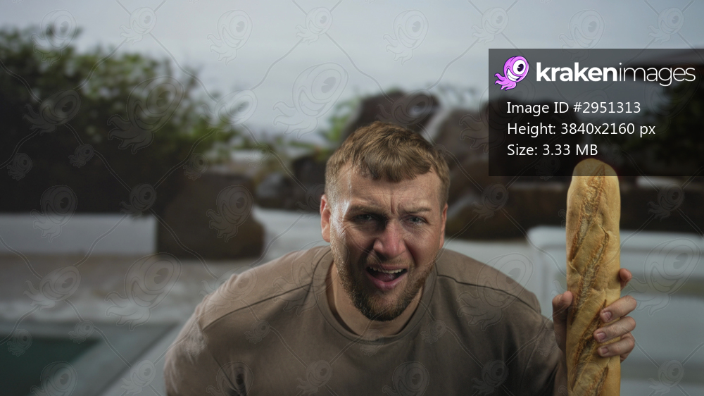 Man holding baguette by hotel pool outdoors with grimacing face and clenched jaw and firm grip; disgust unease.