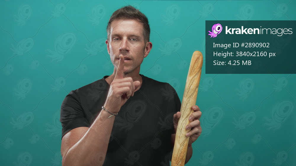 Man holding baguette and finger to lips for silence in teal studio with casual black t shirt and bracelet visible; silence.