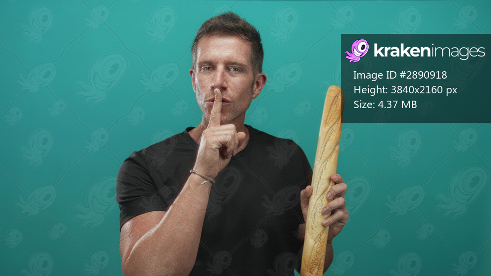 Man holding baguette and finger to lips for silence in teal studio with casual black t shirt and bracelet visible; silence.