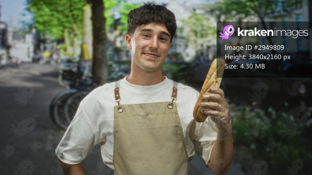 Man holding baguette with gloved hand on street near canal wearing apron and smiling; friendly service.