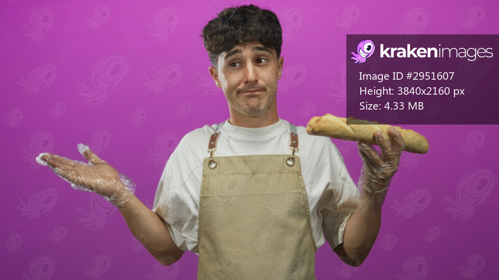Man holding baguette with gloved hands and wearing apron in studio against magenta backdrop; hesitant shrug.