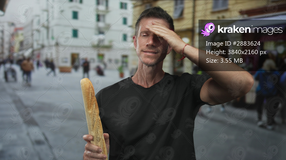 Man holding baguette, hand on forehead on street with eyes closed and slight grimace now; tired hungry.