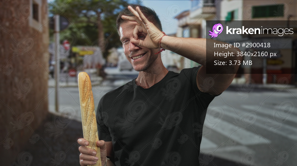 Man holding baguette and making ok sign to eye on street near crosswalk and bakery storefront, wearing black shirt and red bracelet; playful travel.
