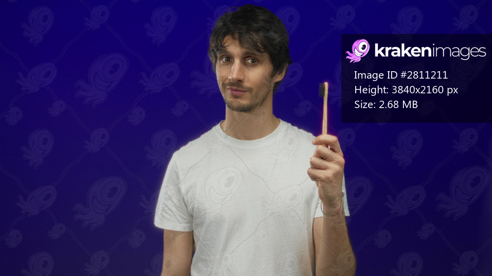Man holding bamboo toothbrush and examining the bristles against a vibrant blue studio setting; wellness cleanliness hygiene care.