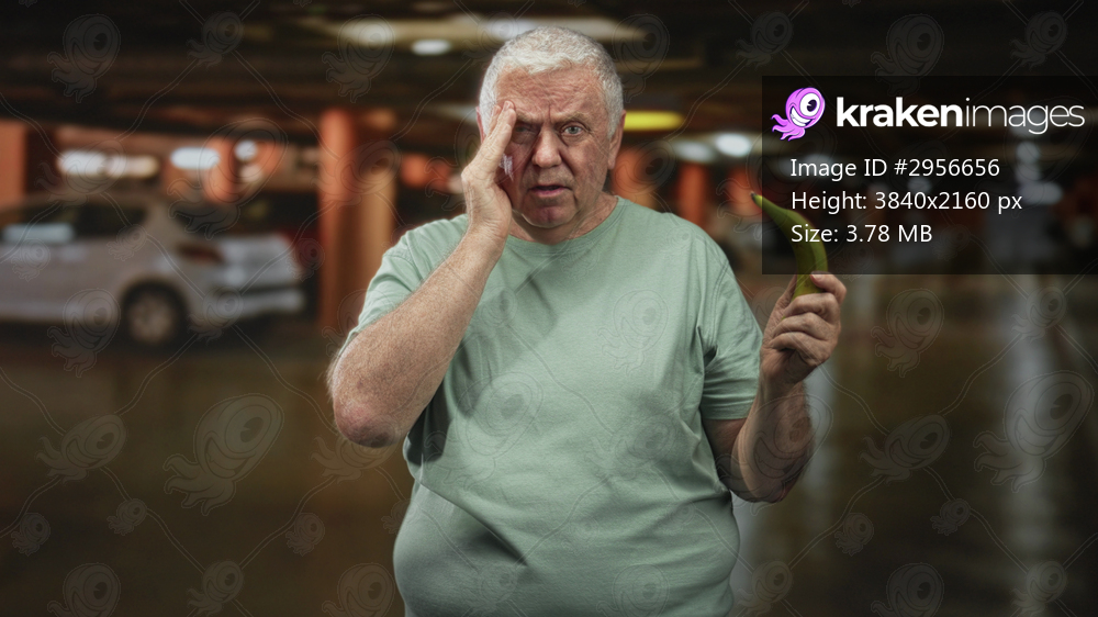 Man holding banana, hand pressed to face rubbing temple in building parking garage, eyes closed and weary expression; fatigue absurdity.