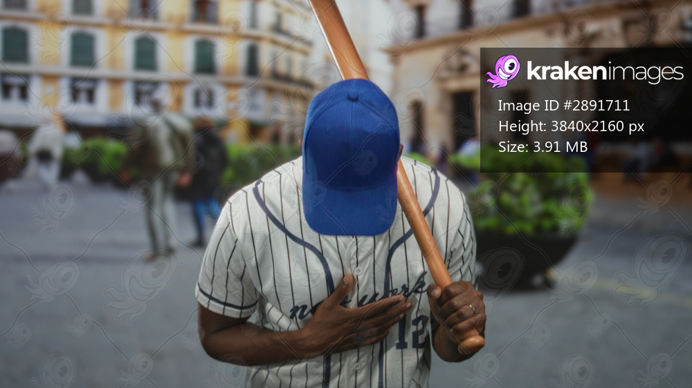 Man holding baseball bat on shoulder on city street in striped jersey and cap, hand briefly on chest in one frame; quiet confidence.
