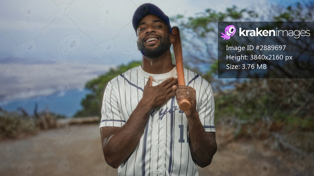 Man holding baseball bat over shoulder and hand on chest in forest, wearing pinstripe jersey and blue cap; confidence.