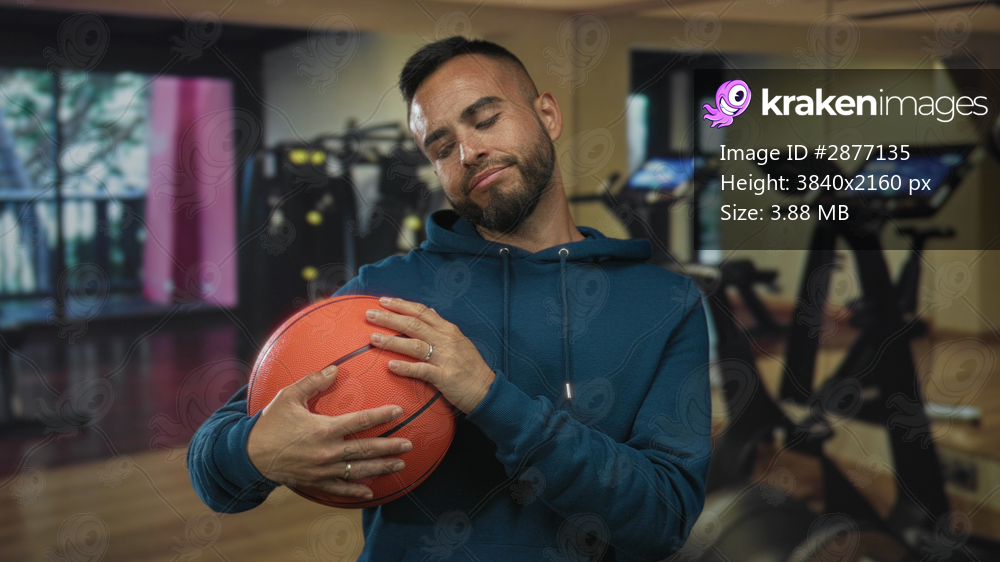 Man holding basketball against chest with hands and closed eyes in gym building, wearing hoodie and rings on fingers; quiet recovery contentment.