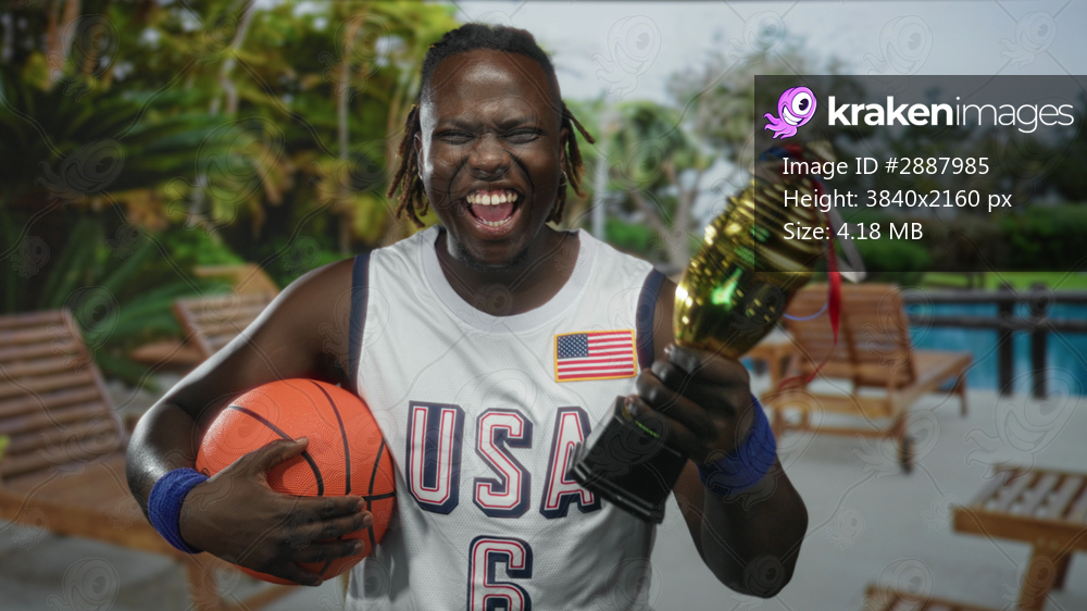 Man holding basketball and gold trophy, hand gripping ball, shouting in building poolside resort; victory celebration pride.
