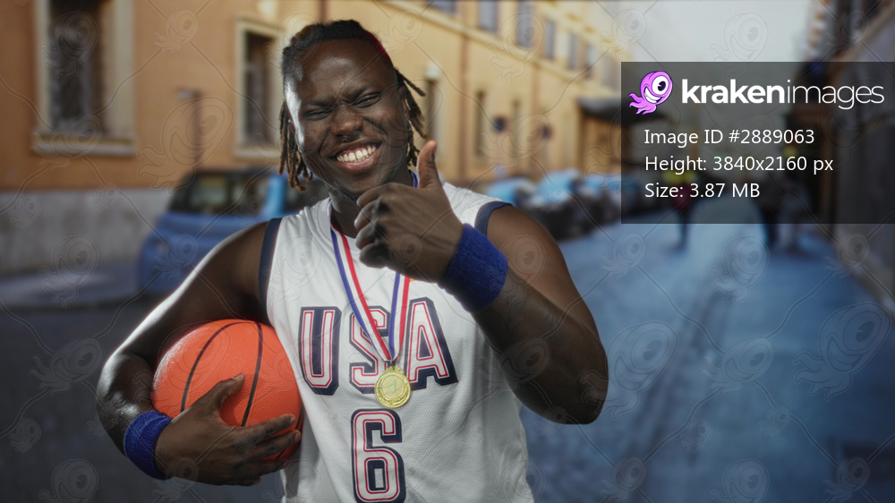 Man holding basketball and medal, adjusting ribbon and giving thumbs up, wearing usa jersey and wristbands on a narrow european street; victory pride.