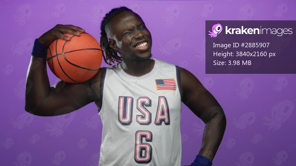 Man holding basketball on shoulder wearing usa jersey and wristband in purple studio smiling and posing; joy athleticism.