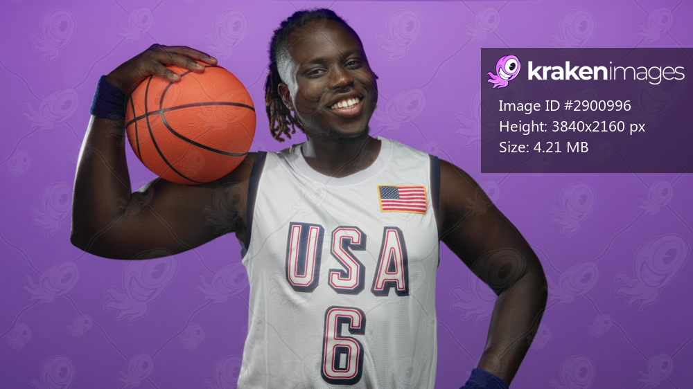 Man holding basketball on shoulder wearing usa jersey and wristband in purple studio smiling and posing; joy athleticism.