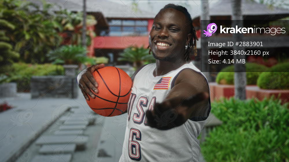Man holding basketball and smiling in front of building wearing usa jersey and wristband; team pride.