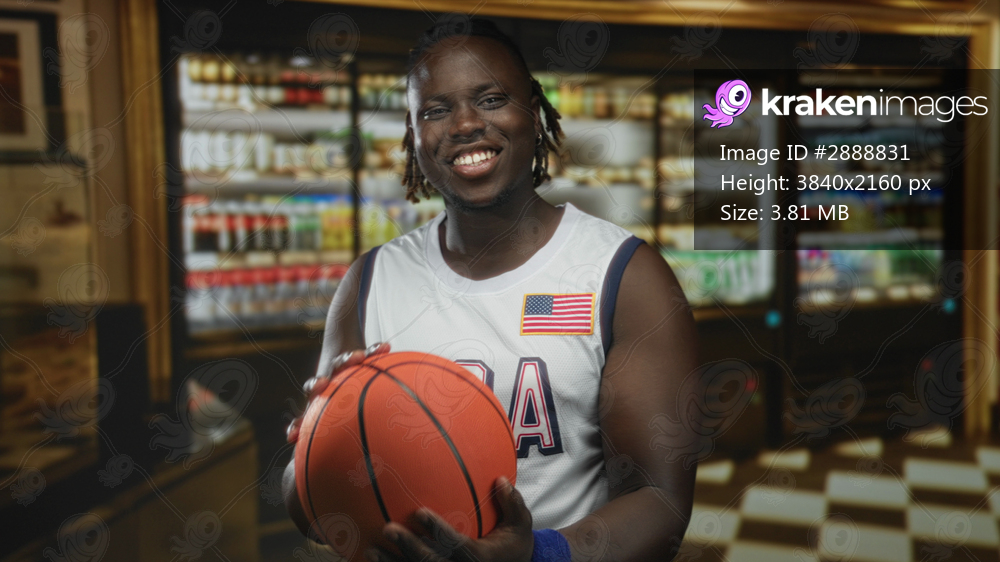 Man holding basketball and smiling while wearing usa jersey with flag patch in building deli aisle; youthful pride.