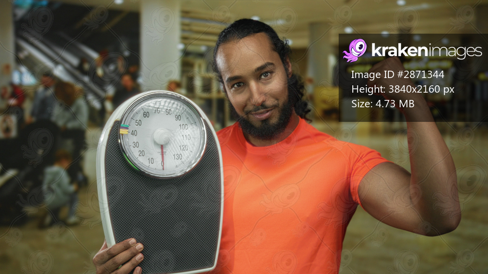 Man holding bathroom scale with visible dial flexes bicep and points to scale in busy airport terminal wearing bright orange shirt; confidence fitness.