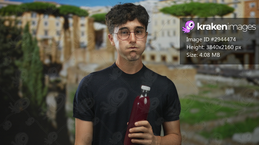Man holding beverage bottle and smiling in ancient roman building ruins while wearing round glasses and a black t shirt; health contentment.