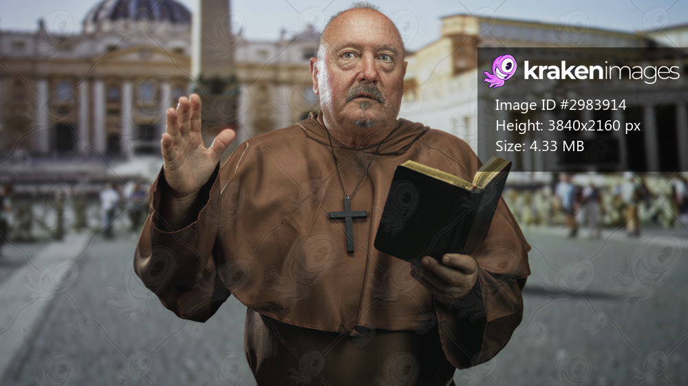 Man holding bible with hands and wearing cross necklace, gazes upward while reading in street near a basilica; devotion.