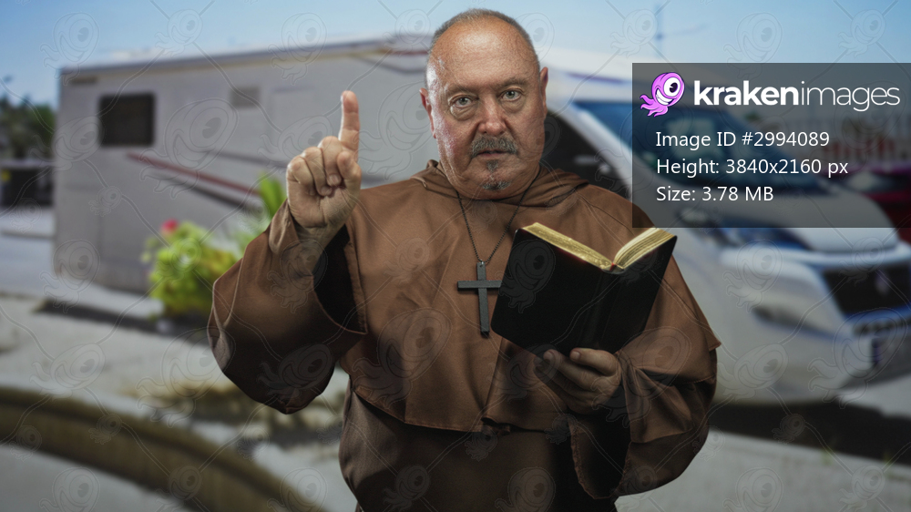 Man holding bible points index finger up in street wearing brown robe and cross pendant; devotion guidance.