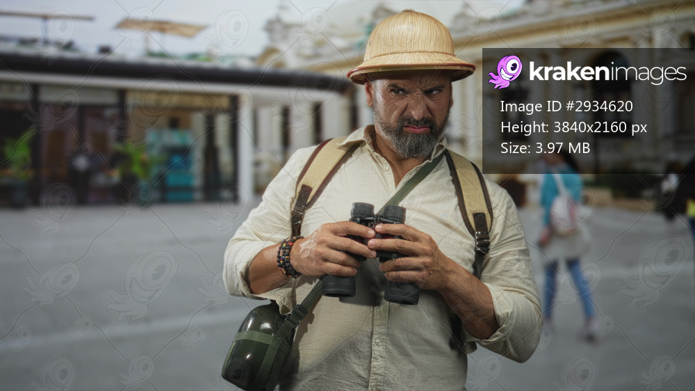 Man holding binoculars and a canteen, grimacing while standing in front of a historic building on a city street; travel curiosity annoyance.