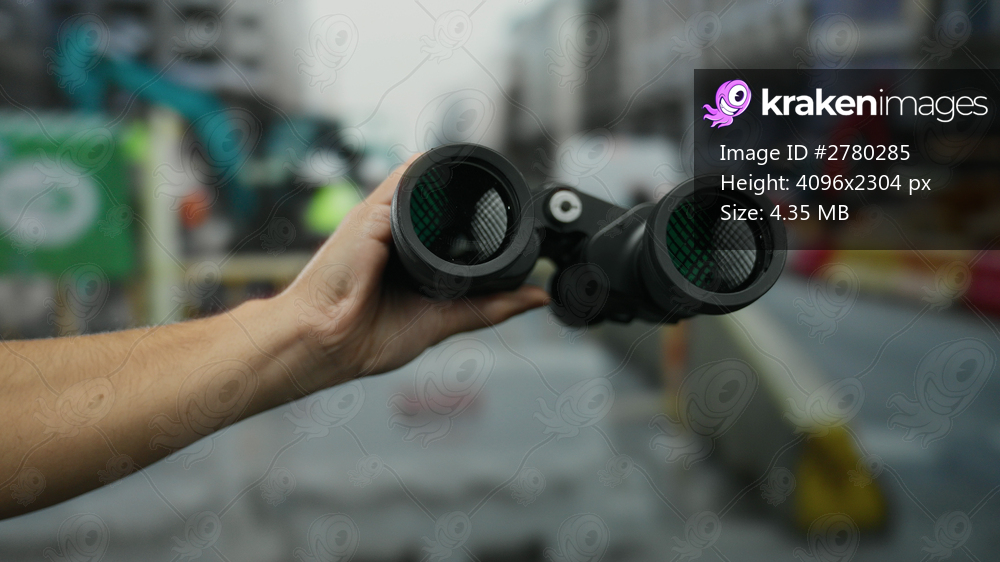 Man holding binoculars on a busy construction site street, showcasing a tool-focused scene with urban outdoor activity and a male presence in a vibrant work environment. - Kraken Images