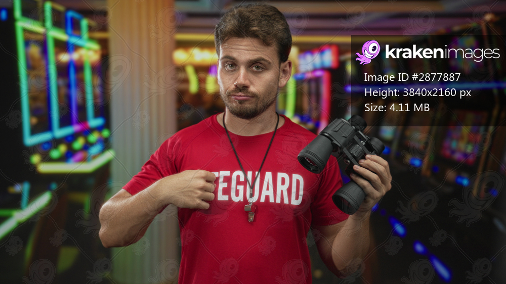 Man holding binoculars and pointing finger at slot machine in casino building; boredom surveillance duty.