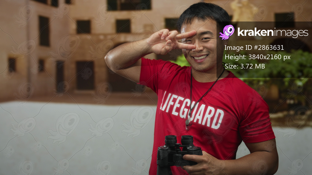 Man holding binoculars and pointing finger in building courtyard with lifeguard whistle visible; vigilance.