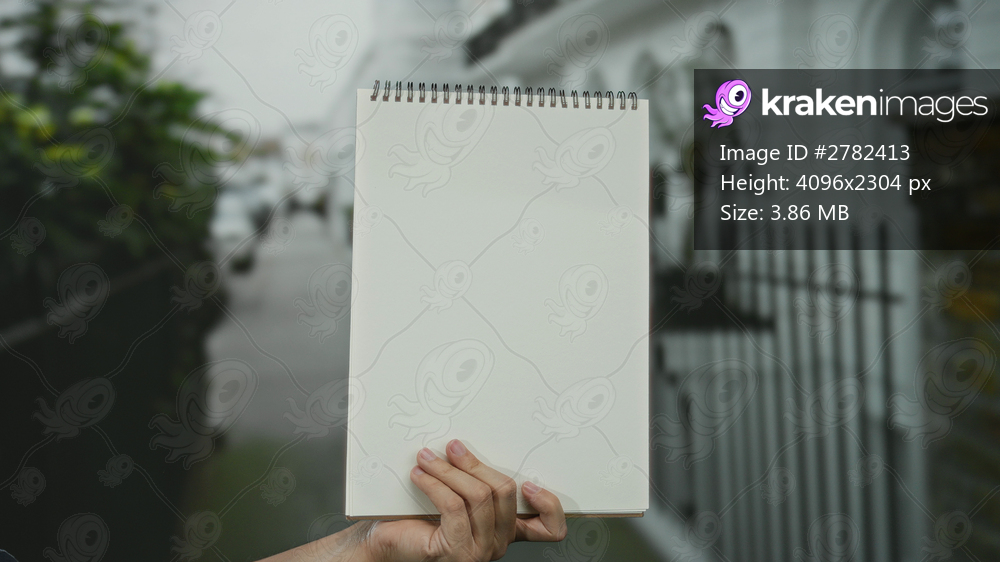 Man holding blank notebook with a spiral binding on a city street, featuring an urban background with greenery and blurred architecture.