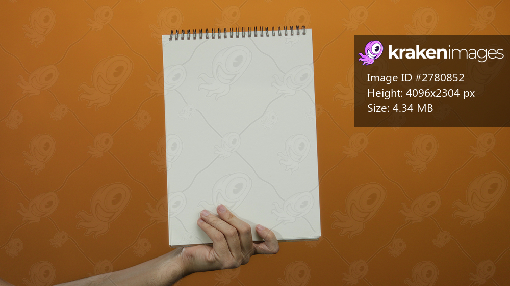 Man holding blank notepad with white pages against orange wall background, emphasizing creative space and isolated ideas in a minimalist setting.