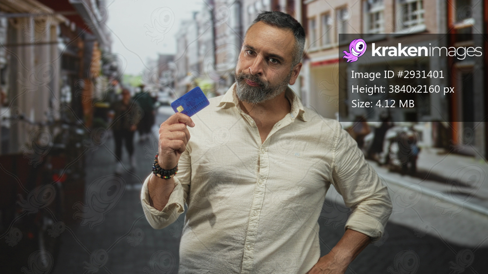 Man holding blue card in his hand on a busy street lined with storefronts and bicycles; skepticism money.