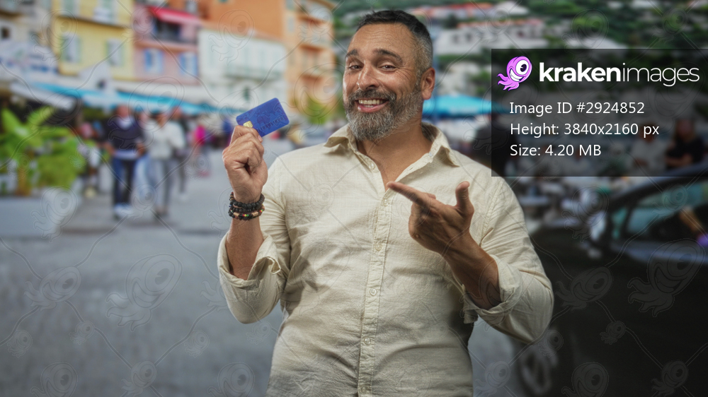 Man holding blue creditcard and finger pointing to card on a lively street market with cafes and pedestrians; confidence payment.